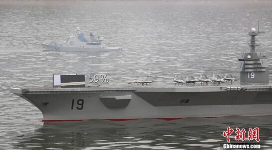 5月6日,河南周口沙颍河上演一场“航母海战”,号称国内最大的一艘航母模型“河南号”带领4艘驱逐舰参与“海战”演习。演习分红、蓝两方。经过近20分钟的激烈战斗,红方在航母的火力支援下,“舰艇”和“飞机”顺利登陆岛屿。这场在周口沙颍河上首次进行航模表演的“海战演习”活动吸引了众多市民围观。河南省社会体育管理中心海南省航海模型运动队队长王云飞介绍,该航母模型命名为“河南号”,是按照1∶55制作比例打造,全长6米,宽1.5米,高0.7米,满载排水量为800公斤,采用双电机推进,最高航速为25千米/小时,续航时间90分钟。在它的甲板上,装载着20多架作战飞机和一些车辆设备(模型),可以起降飞机和直升机,舱内还装备了各种火炮和火箭发射装置。该艘“河南号”航母模型共花费十几万元,总重超过500公斤。