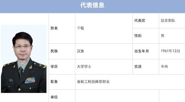 北京市人大常委会网站近日更新的北京市第十四届人大代表相关信息披露,曾担任过原第二炮兵装备部副部长的干敏少将,目前担任金轮工程指挥部部长职务。