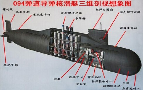 094最重要的作战武器当属其搭载的12枚巨浪2型潜射洲际弹道导弹,巨浪2弹长13.2米,弹径2.25米,采用一级固体,二级液体的两级火箭发动机,总重量为23吨,弹体采用碳纤维复合材料制造,因此具有更大的强度和更轻的重量,射程超过8000千米,该导弹可搭载3-4枚爆炸当量为25万吨的分导式热核弹头,采用捷联惯性、弹道计算机、激光陀螺、天文导航复合式导航方式,命中精度在300米以内。