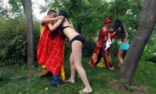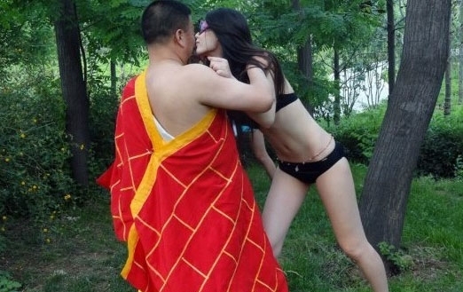 热吻裸体雕塑现西安公园 妈妈拉孩子