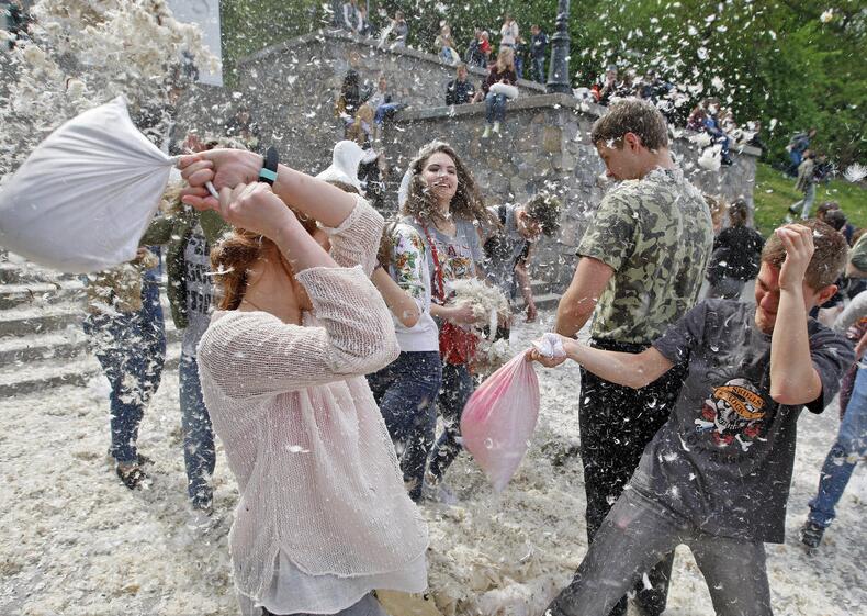 乌克兰举办枕头大战 现场变羽毛海洋